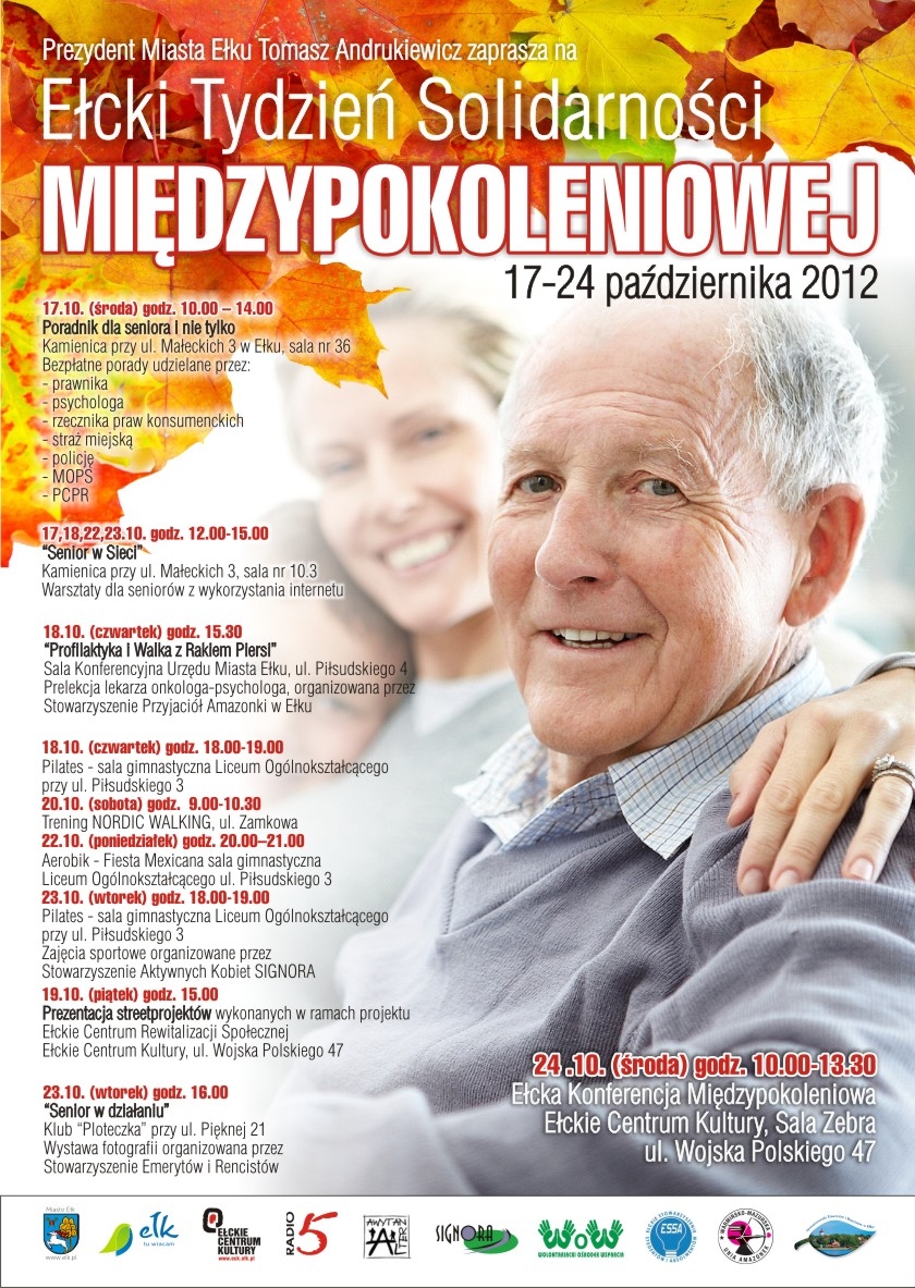 Ecki_Tydzie_SolidarnociPrezydent Miasta Ełku zaprasza w dniach 17 – 24 października do udziału w obchodach Ełckiego Tygodnia Solidarności Międzypokoleniowej, które organizowane są w ramach "Europejskiego Roku Aktywności Osób Starszych i Solidarności Międzypokoleniowej".